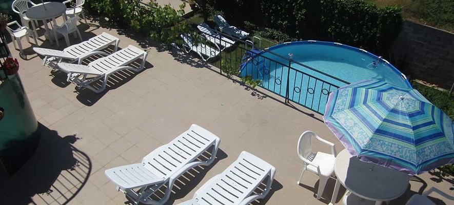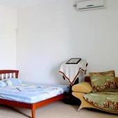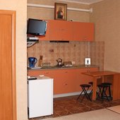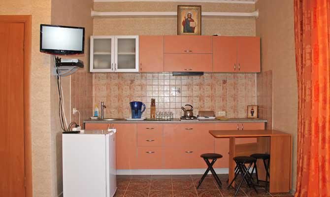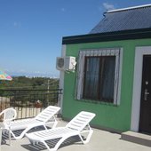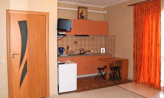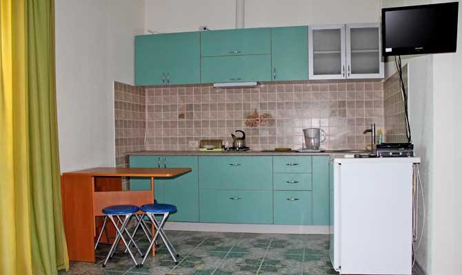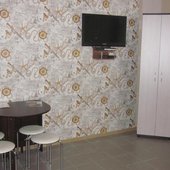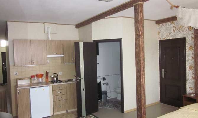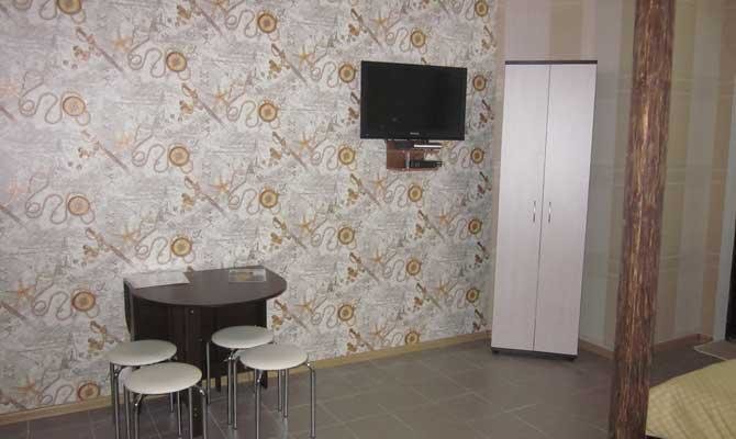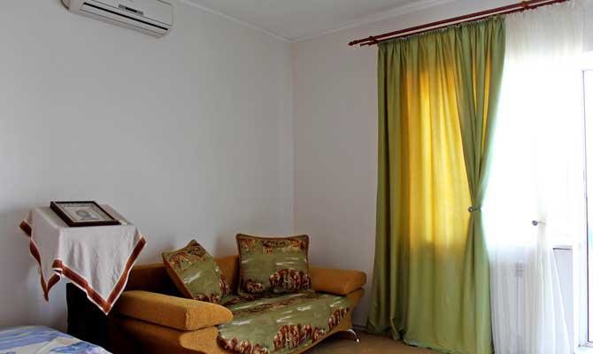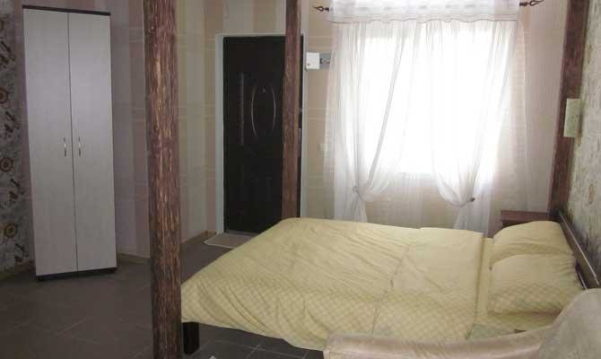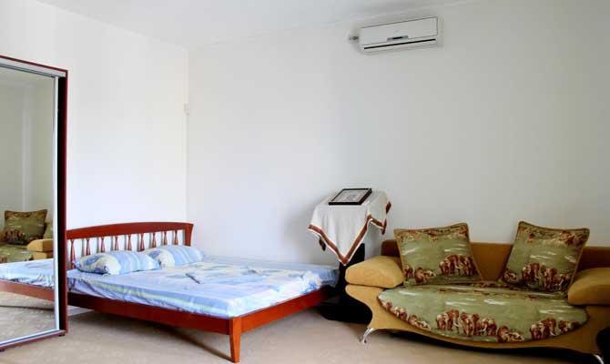 Очень приемлемая стоимость проживания для гостевого дома. На территории есть бассейн. Внизу в здании общая кухня и даже барная зона. Номер с кондиционером, отдельной ванной комнатой, холодильником. В общем, все необходимое для пребывания в отпуске.