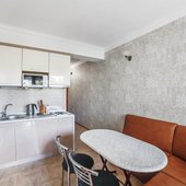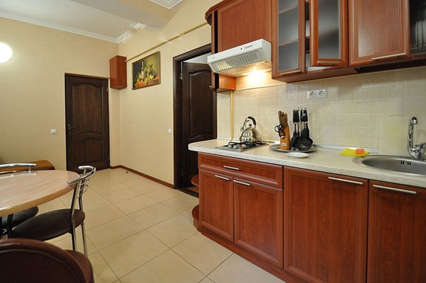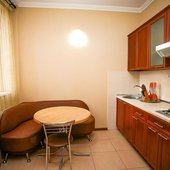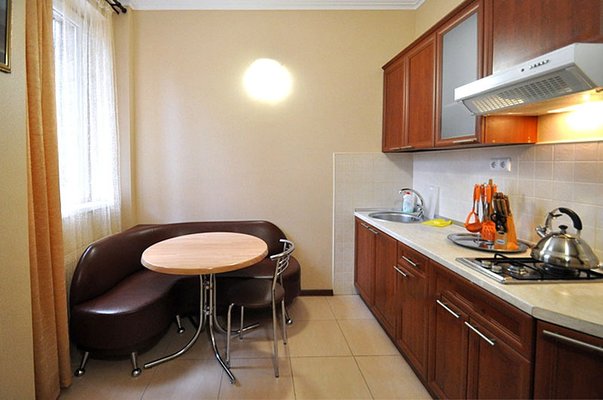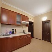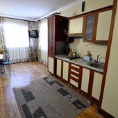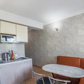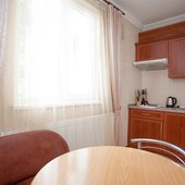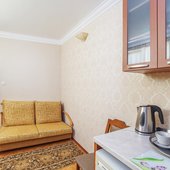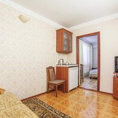 Питание в гостинице не предусмотрено, проживающие самостоятельно могут готовить еду в номерах, которые оборудованы кухонной зоной, где есть холодильник, мойка, плита, вытяжка, мягкий уголок и посуда.