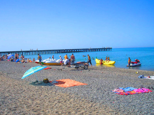 Песчано-галечный поселковый пляж находится на расстоянии 500 м. от гостевого дома. Он оборудован, имеет прокатную службу, где можно арендовать зонт или шезлонг. Любители активного отдыха могут воспользоваться площадкой для пляжного волейбола и пунктом аренды катамаранов.