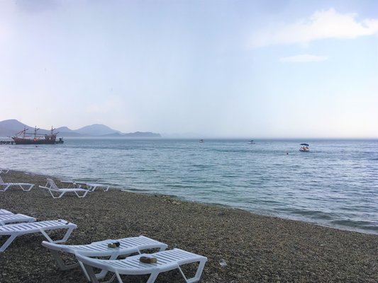 Междугородним автобусом до автостанции г.Феодосия, далее автобусом "Феодосия-Судак" до автостанции пос.Коктебель, отель находится через дорогу.