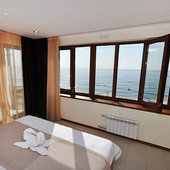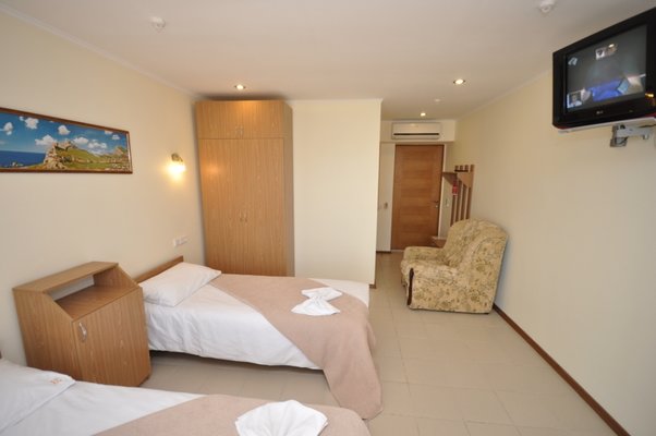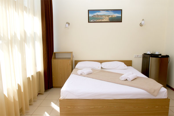 Самолетом до аэропорта г.Симферополь, далее из аэропорта маршрутным такси или от автостанция "Курортная" рейсовым автобусом до автовокзала г.Феодосия, далее пешком до отеля 800 м (через железнодорожный мост) или на такси