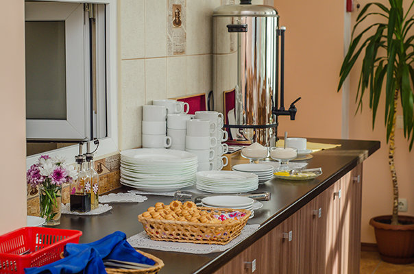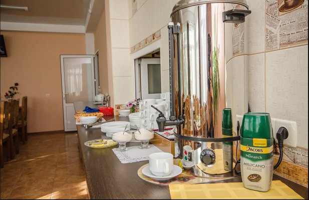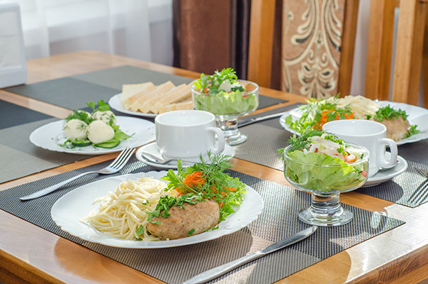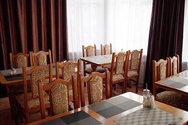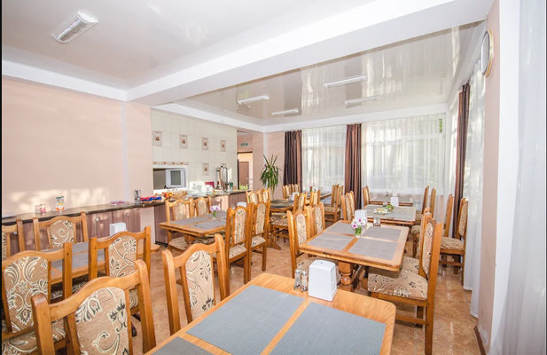 Обеденный зал — отдельное здание, европейская кухня, работает: 07:30-20:00