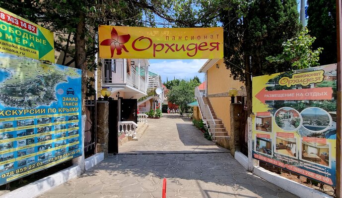 Отель «Орхидея» — это уютный комплекс двухэтажных коттеджей, расположенный в живописном уголке Южного берега Крыма, на территории природного заказника Канака, между Судаком и Алуштой (около часа езды до каждого города). В шаговой доступности находятся магазины, кафе и мини-рынок. Расстояние до аэропорта Симферополя — 98 км, до железнодорожного вокзала — 81 км.