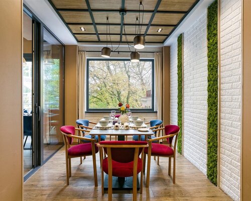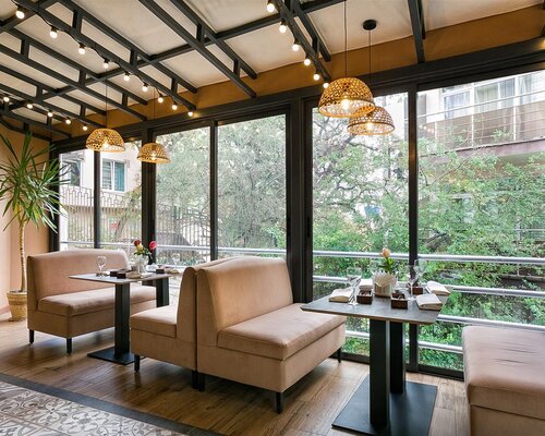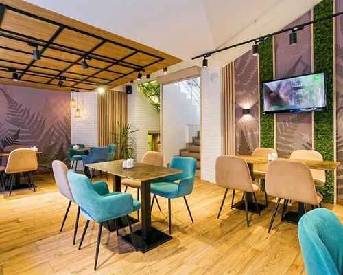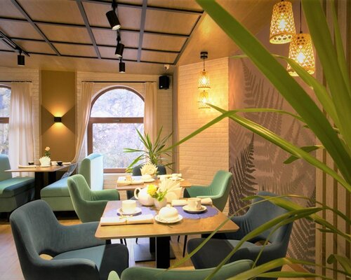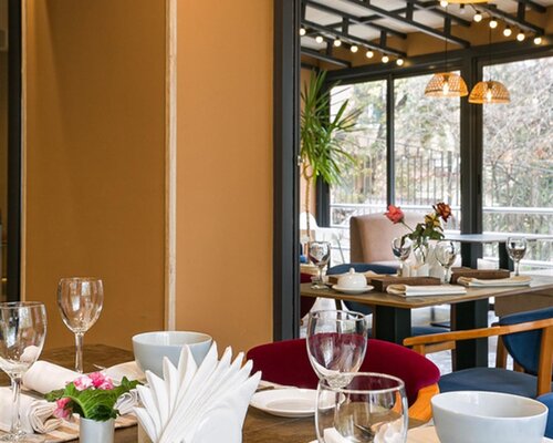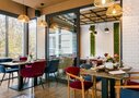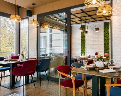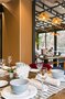 В ресторане с современным дизайном гости могут насладиться изысканными блюдами на открытой террасе, расположенной вдоль основного зала.