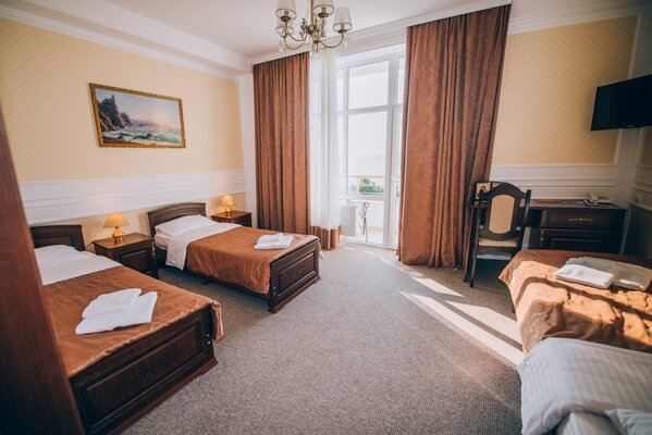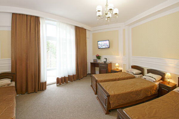 В пяти минутах ходьбы от пансионата находится широкий песчаный пляж, оснащенный шезлонгами, навесами от солнца и раздевалками.