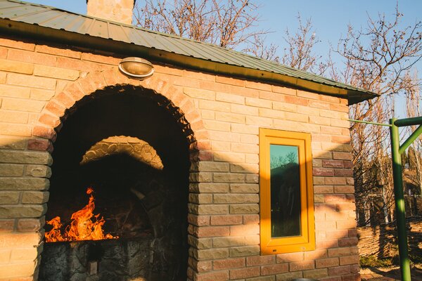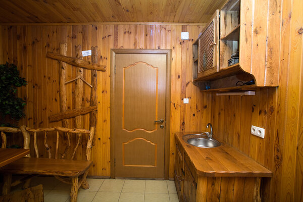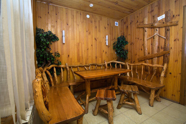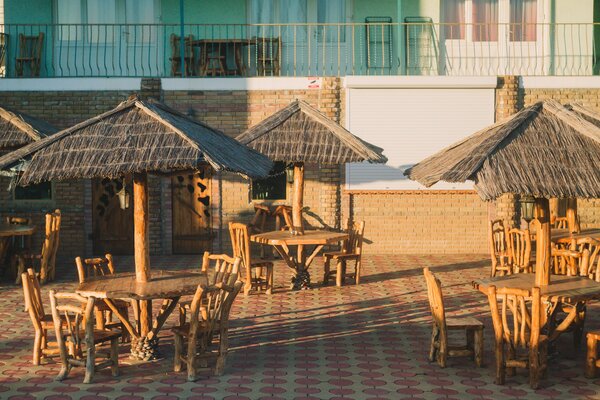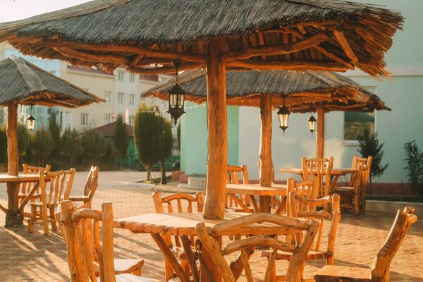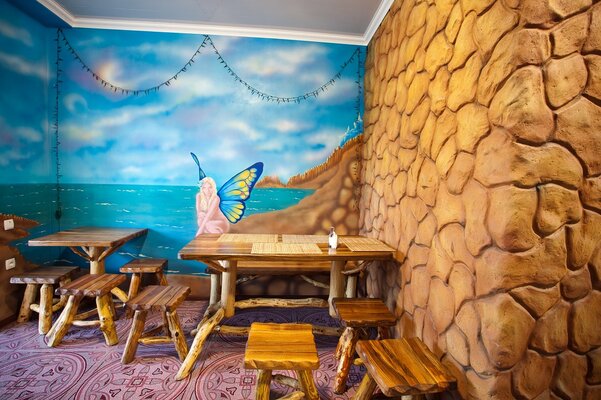 В зимнее время питание проходит в закрытом отапливаемом помещении, а летом – на открытой площадке кафе. Столы и стулья из натурального дерева создают атмосферу