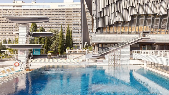 Олимпийский бассейн с подогреваемой круглый год морской водой, детский бассейн с водными аттракционами; бассейны для прыжков в воду и с водным баром.