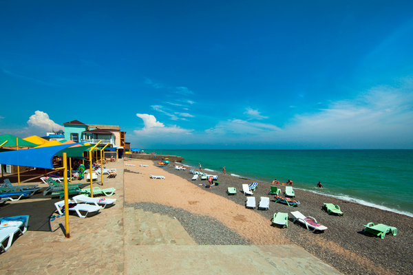 - песчано-галечный пляж на территории санатория с шезлонгами и зонтиками;