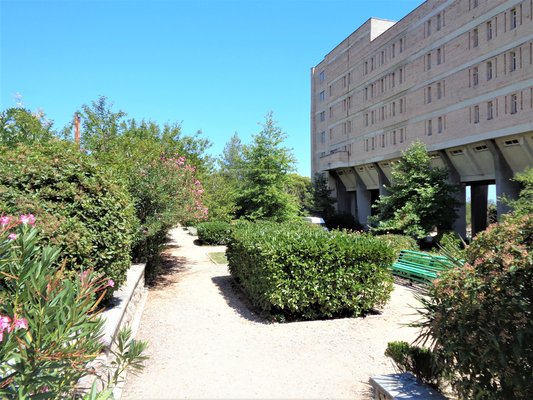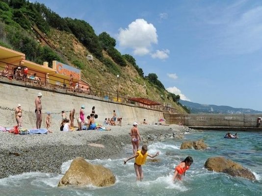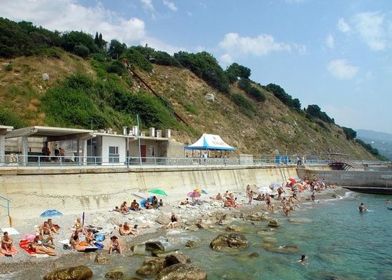 Спускаться на берег нужно по парковой лестнице из 300 ступеней. Благоустроенный городской галечный пляж в 200 метрах от спального корпуса. Пляж оборудован лежаками и навесами.