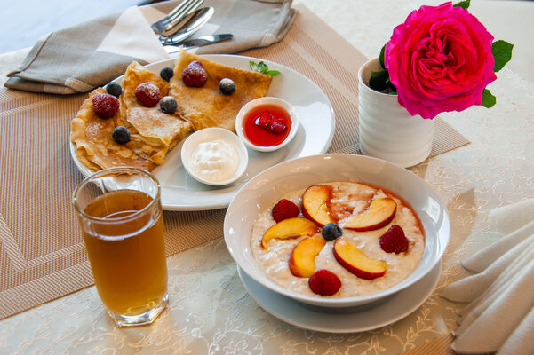 Предлагаем несколько вариантов завтраков и напитков стоимость которых включена в счёт за проживание. По Вашему желанию можем выполнить индивидуальные заказы на завтрак для наших гостей.
