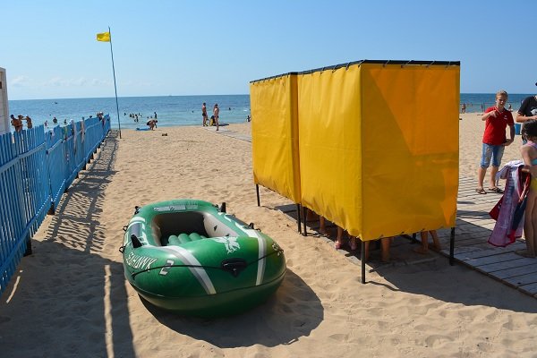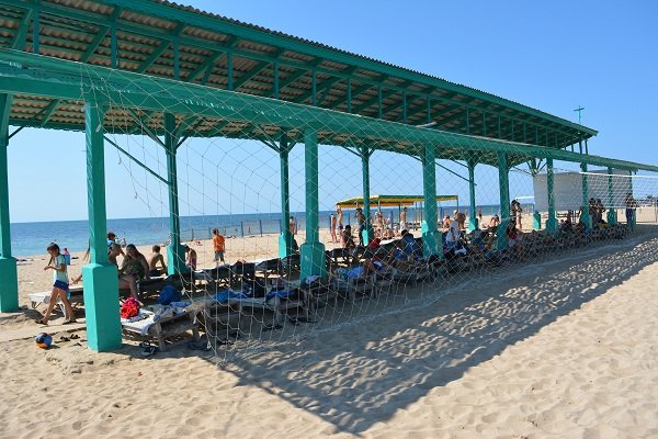 Собственный благоустроенный песчаный пляж, оборудованный зонтиками, лежаками, туалетом.