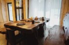 - просторная комната отдыха для посиделок с большим столом, телевизором и панорамными окнами с видом на лес;
