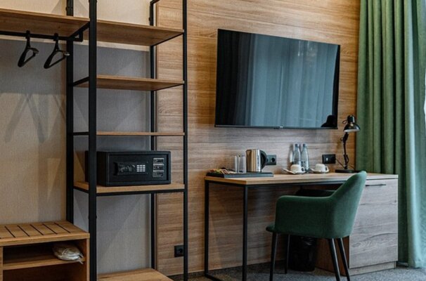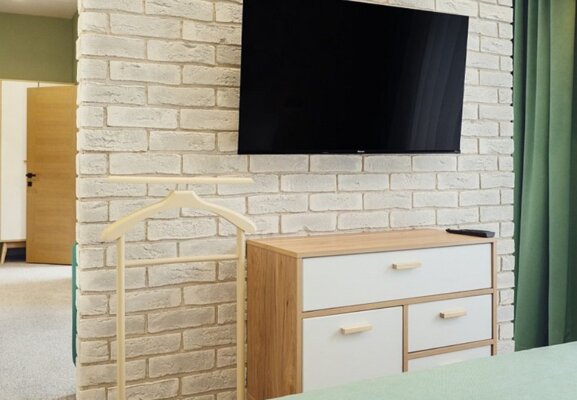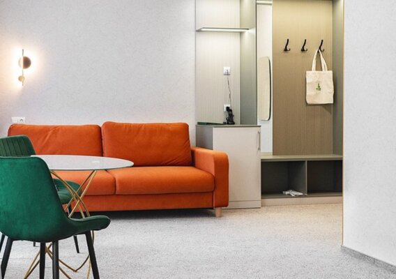 - просторная комната отдыха для посиделок с большим столом, телевизором и мягкой зоной;