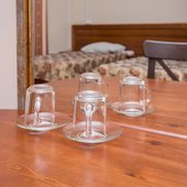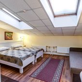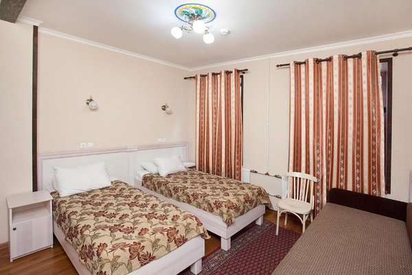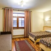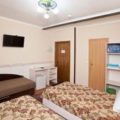 В каждом имеется спальная зона с двумя раздельными кроватями, также размещен большой диван. В качестве удобств установлен телевизор, стол и стулья. Ванная комната отведена на каждый номер.