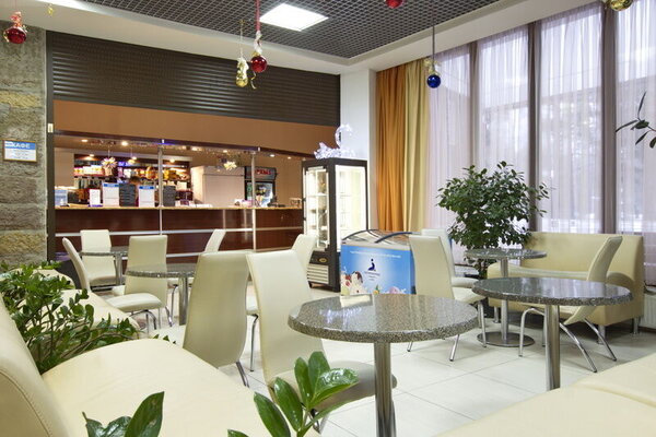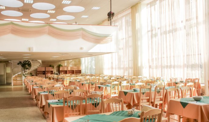 К услугам гостей три великолепно оборудованных обеденных зала. Гостям предлагается широкий выбор закусок, первых и вторых блюд. Лечебное питание предусматривает стандартные диеты для отдыхающих.