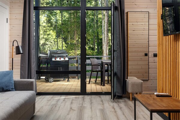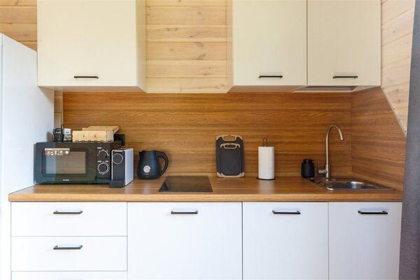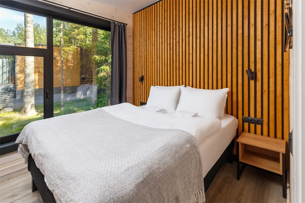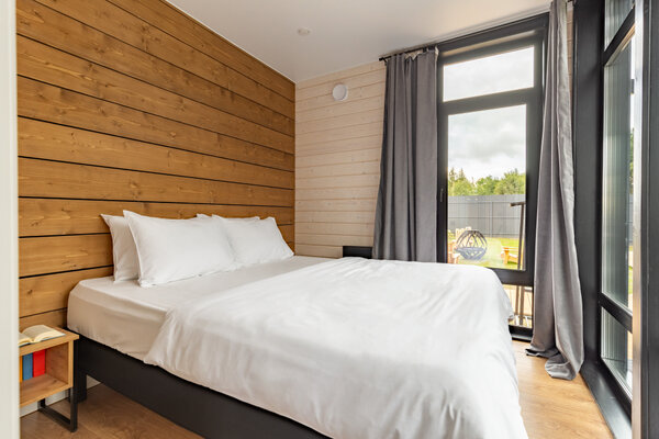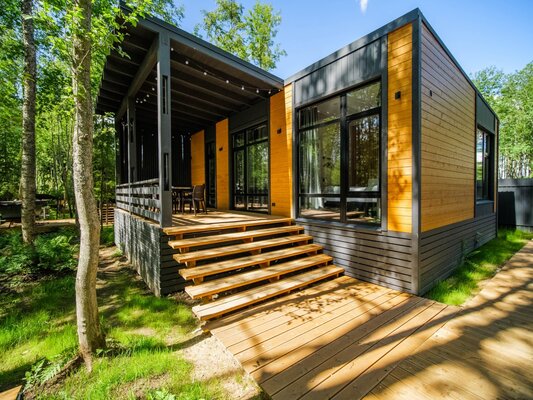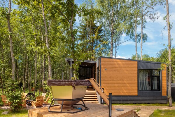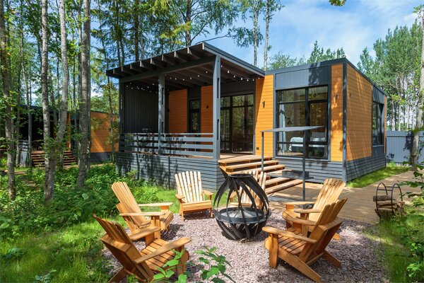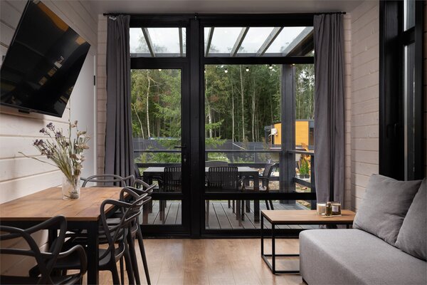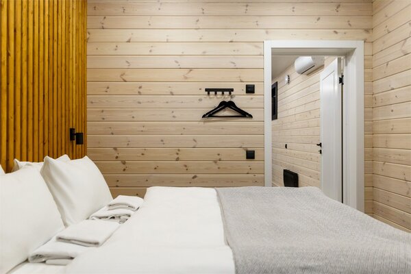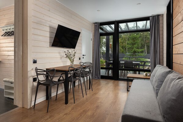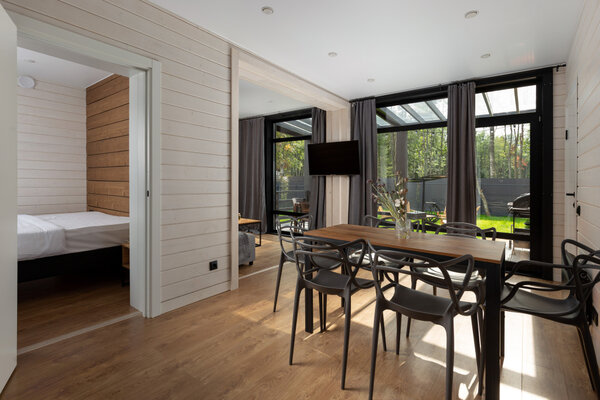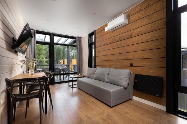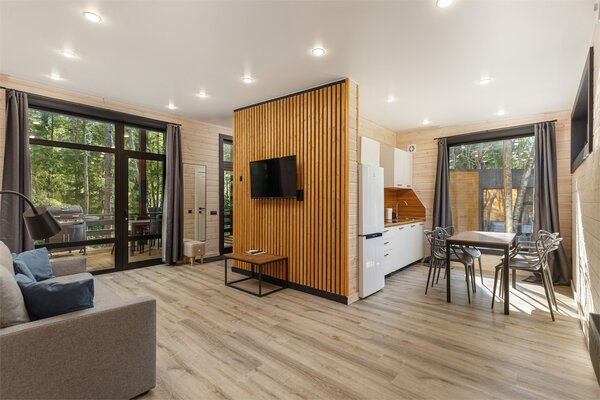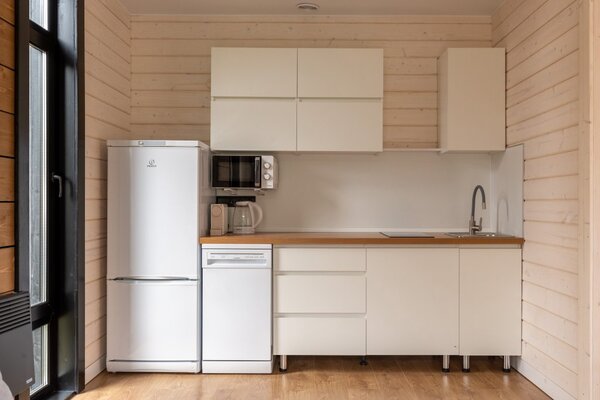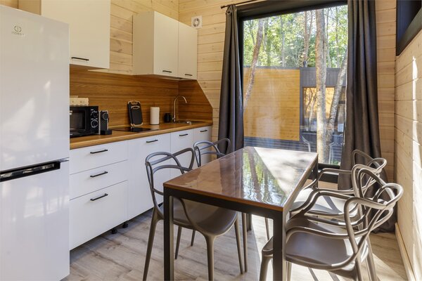 Наши коттеджи, рассчитанные на компании от 2 до 6 человек, продуманы до мелочей для вашего удобства. В каждом доме вас ждёт просторная кухня-гостиная, полностью оборудованная для комфортного проживания: холодильник, микроволновая печь, варочная панель, посудомоечная машина и полный набор посуды. Атмосферу уюта дополняют панорамные окна, наполняющие пространство светом, тёплые полы и телевизор для вечернего досуга.