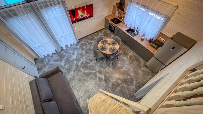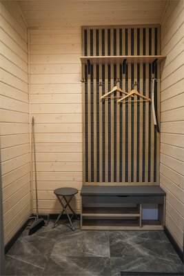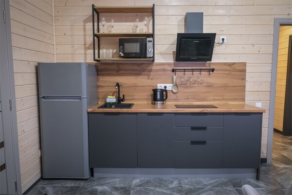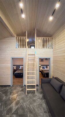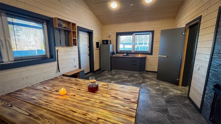 Баня на дровах вмещает до 6 человек. Парилка, помывочная зона, душ, туалет, просторная комната отдыха со своей кухней. Площадка для барбекю, барная зона на улице.