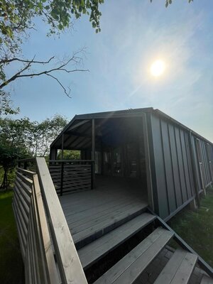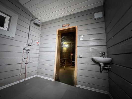 Большая баня площадью 58 м². Аренда от 3 часов. Есть оборудованный спуск к воде.