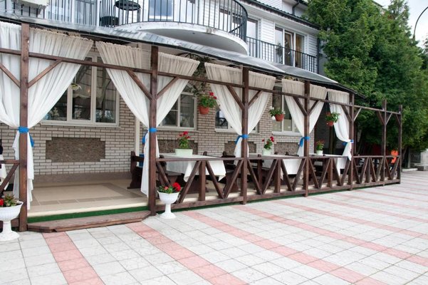 Свадебное торжество можно провести в залах ресторана, летнем шатре или на открытой террасе отеля.