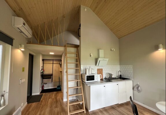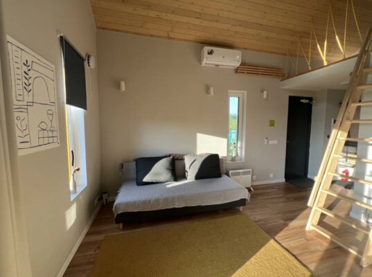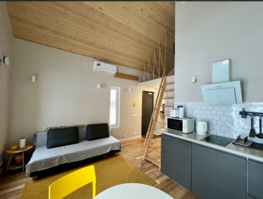 Насладитесь тихим отдыхом вдали от городской суеты в уютных домиках в поле. До Красного озера с обустроенным пляжем – всего 15 минут езды. К вашим услугам комфортабельный домик с кухней-гостиной и выходом на террасу, спальней на втором этаже и собственной ванной комнатой с горячей водой. В домике есть всё необходимое для комфортного проживания: от бытовой техники (холодильник, плита, микроволновка) до постельного белья и средств гигиены. Круглый год поддерживается комфортная температура благодаря кондиционеру, тёплому полу и конвектору. На территории к вашим услугам зона барбекю, кострище, площадка для пикника и бесплатная парковка. Любимцы разрешены (с ограничениями по весу и количеству).