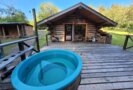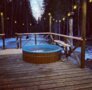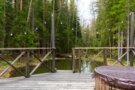 Сруб из карельской сосны, купель на террасе с выходом к живописному лесному пруду.
