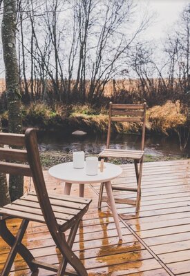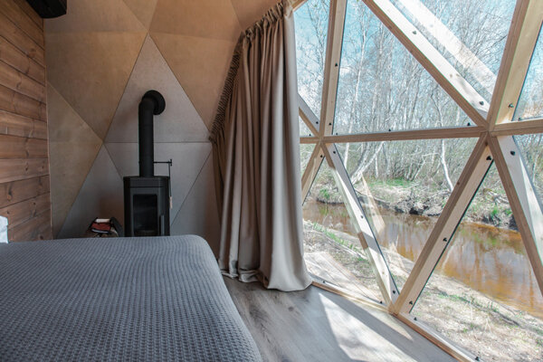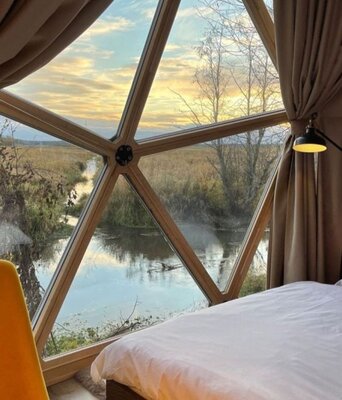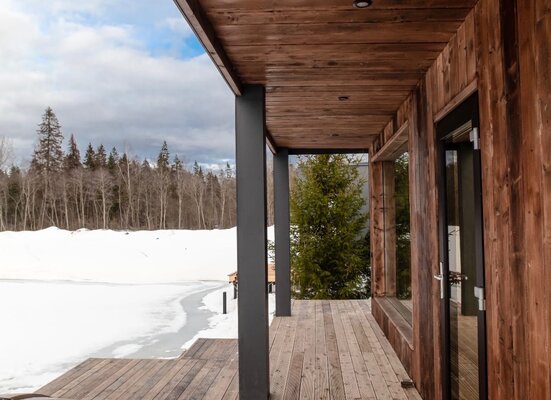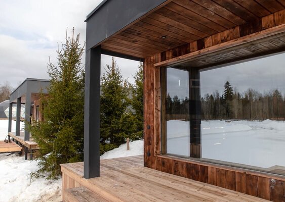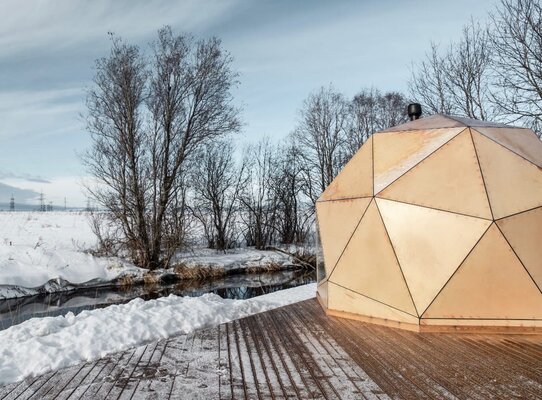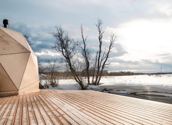 Панорамный вид на пруд и лес из парной, при этом полная приватность и уединение — бани расположены вдалеке от зоны глэмпов — никто не помешает вашему отдыху.