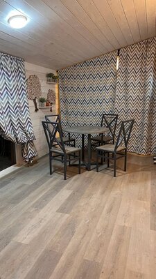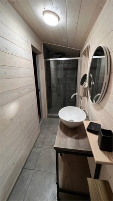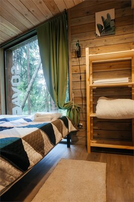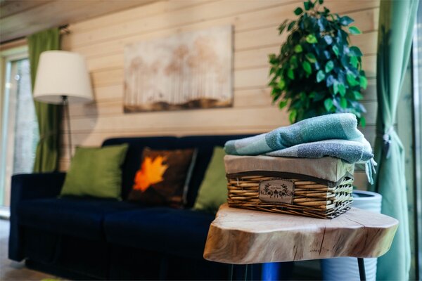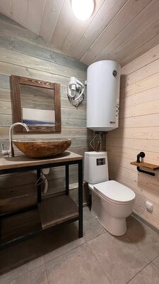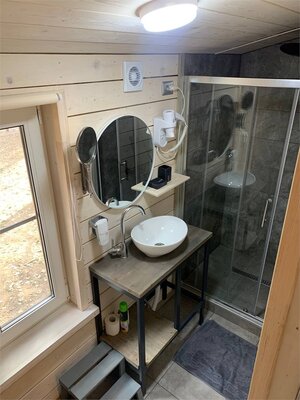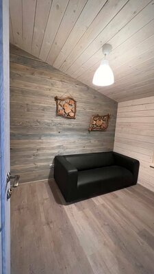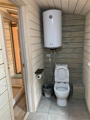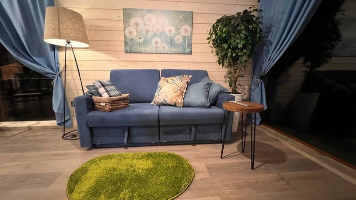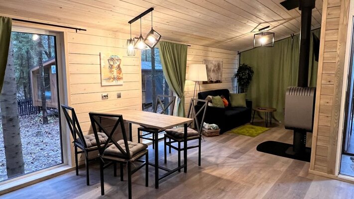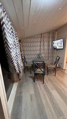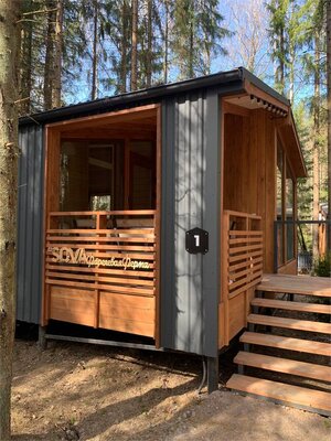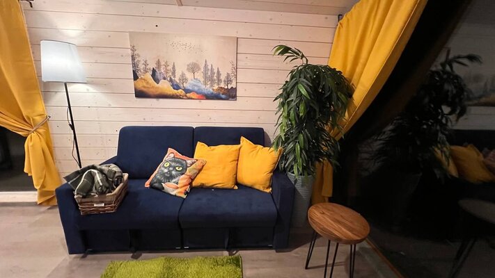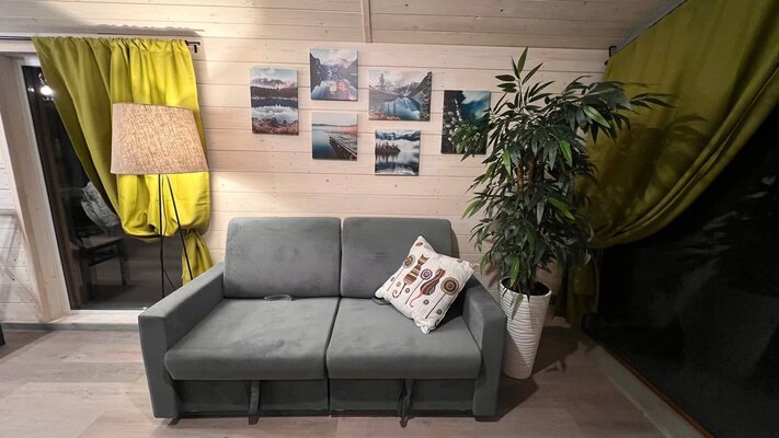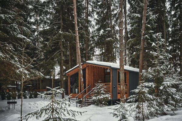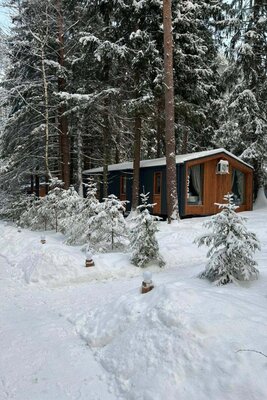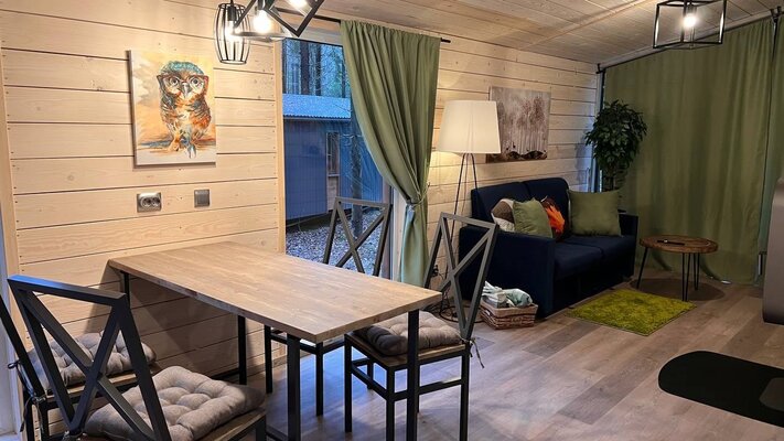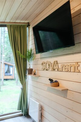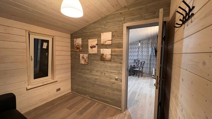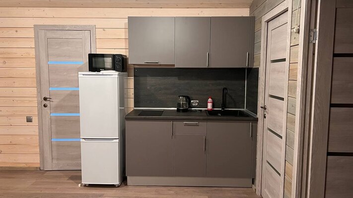 В банном доме есть кухонная зона с кулером, микроволновой печью, чайником и посудой, гостиная зона с панорамными окнами, столом, диваном и телевизором. Совмещенный санузел. Крытая терраса с уличной мебелью.