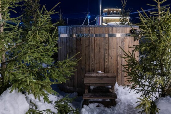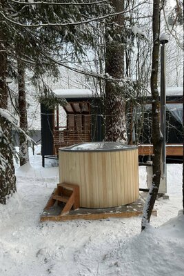 Горячие ванны на открытом воздухе. Деревянная круглая бочка с удобными сиденьями и подсветкой, наполняется тёплой водой (t-35-45С). По запросу наберут холодную воду для сочетания с горячими банными процедурами.