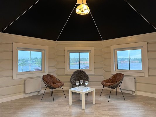Бани оборудованы инновационными и стильными печками Grill’D Retro которые дают непревзойденный мелкодисперсный пар. Для вас приготовлены душистые травяные матрасы, полки из дикого кедра, оборудованные системой свежего дыхания и еще много других банных фишек, которые позволят вам получить истинное наслаждение от посещения нашего банного комплекса. А из большого окна парилки открывается потрясающий вид на реку Свирь с проплывающими мимо теплоходами. После парения вы можете окунуться в холодные воды Свири со специально оборудованного пирса или же наоборот, посидеть в расслабляющем чане Фурако.