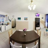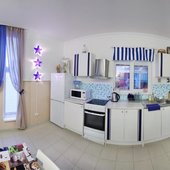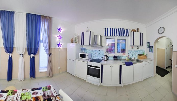 Кухонная зона оборудована всем необходимым — плитой, микроволновой печью, кофемашиной, что позволяет готовить самостоятельно в любое удобное время.