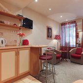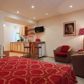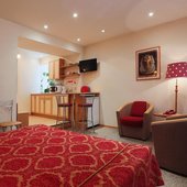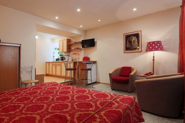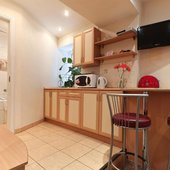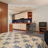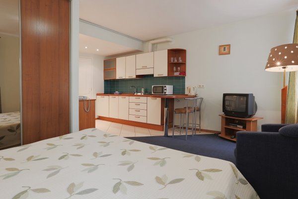 Каждая студия имеет полное оснащение: здесь есть индивидуальная ванная комната, кухни , зона отдыха и спальное место.