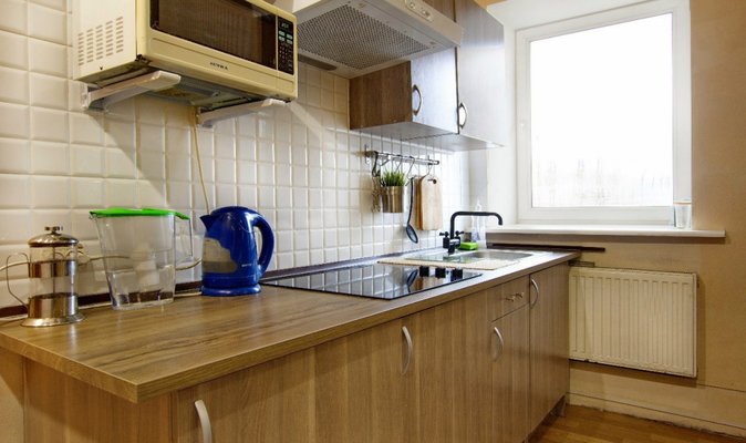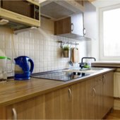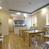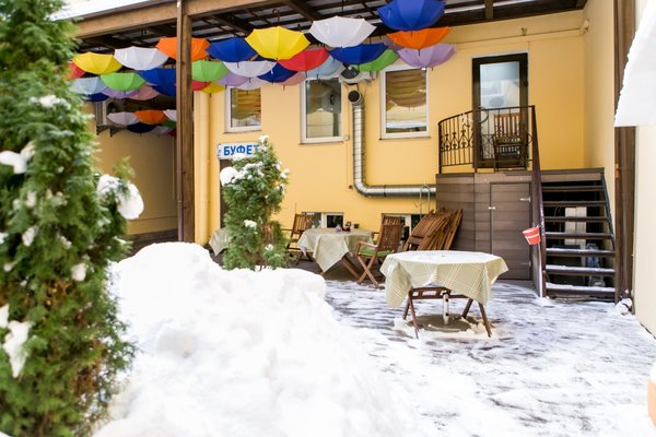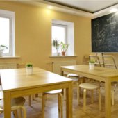 В распоряжении гостей общая кухня-столовая с варочной поверхностью, микроволновой печью, холодильником, чайником, посудой, кухонной утварью и столовыми приборами. Кроме этого на первом этаже здания работает буфет.