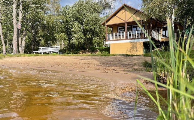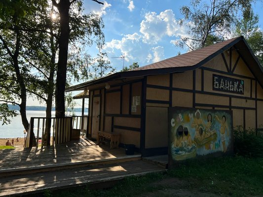 Новая сауна на берегу озера - вмещает 10 человек, есть душ, туалет и комната отдыха с большим столом, чайником и телевизором. А зимой еще и прорубь!
