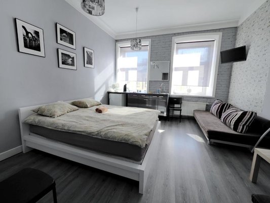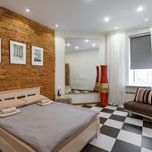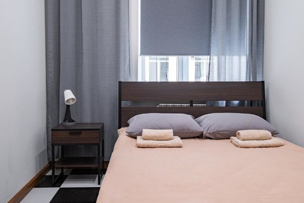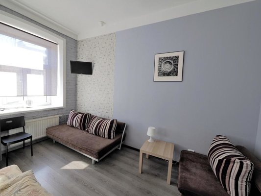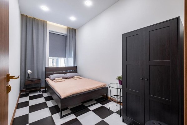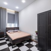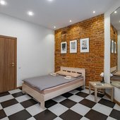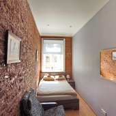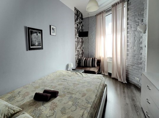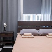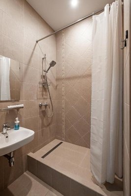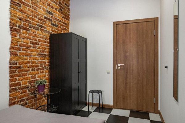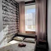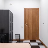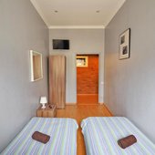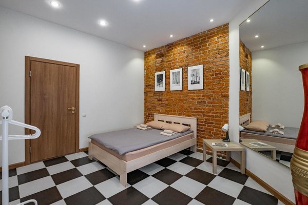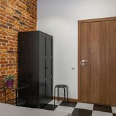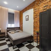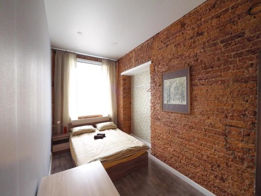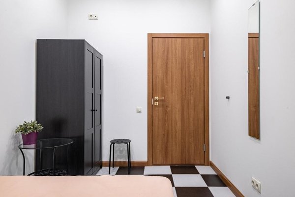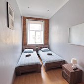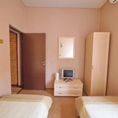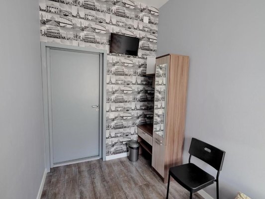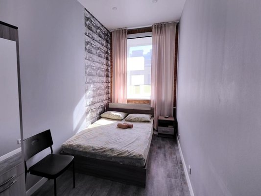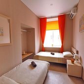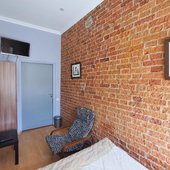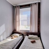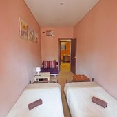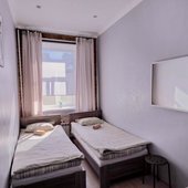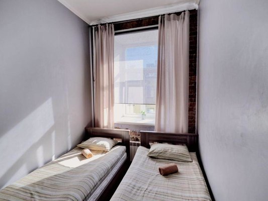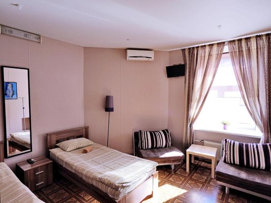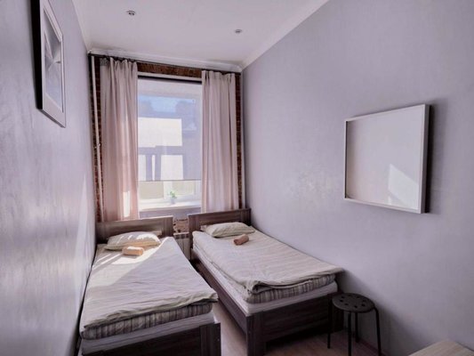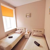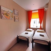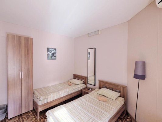 Комнаты красивые, оформлены оригинально. Гостям нравится оригинальный дизайн. Состояние комнаты идеальное. До заезда гостей регулярно проводится уборка со сменой белья. В комнате есть все необходимое: две односпальные кровати, шкафы, вешалка, зеркало, тумбочки, стол, стулья, телевизор, кондиционер. Душевая и туалетная комнаты — одна на всех.