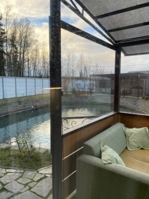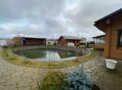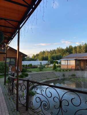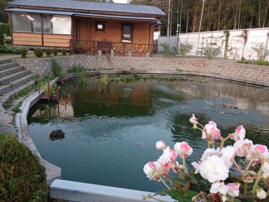 На территории водоем 20х16м с проточной водой в 20 м от бани, можно окунуться или моржевать. Зимой t воды в водоеме + 4С. Летом комфортно + 20-25С, можно купаться, глубина водоема до 2,5м.