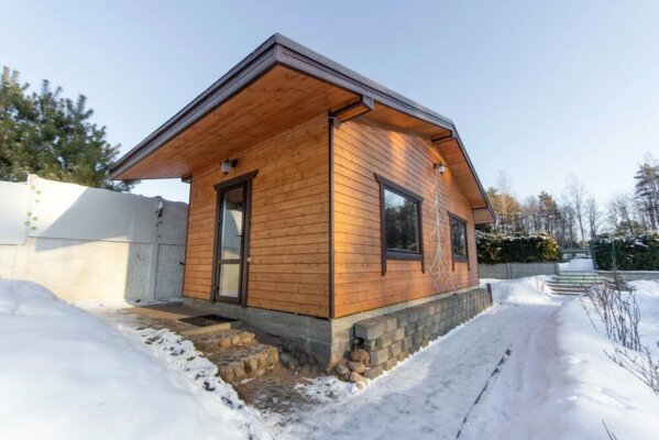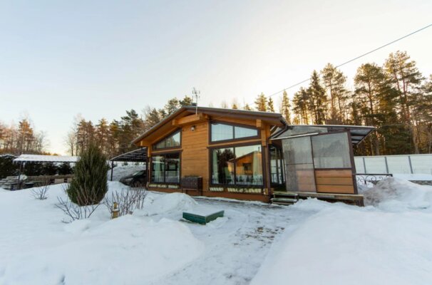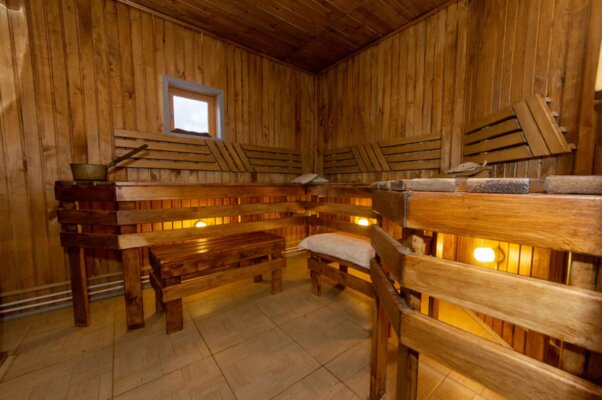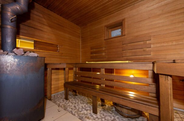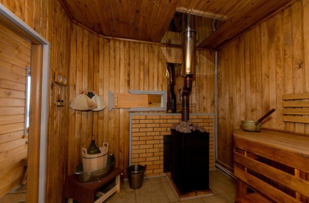 Новая баня на дровах с финской печью. Ничего лишнего — упор сделан на парную: объем воздуха, дыхание первое и «второе», сухой или влажный пар, воздушные, водные, снеговые процедуры и медовый чай с лимоном и жасмином.