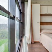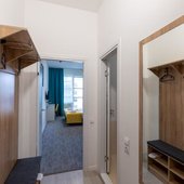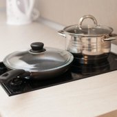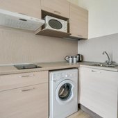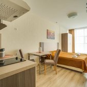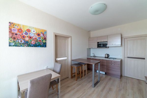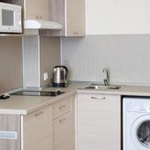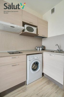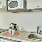На кухне можно приготовить или разогреть еду. Также рядом находится кафе, в котором можно пообедать или поужинать.
