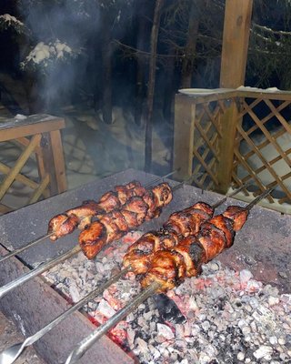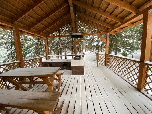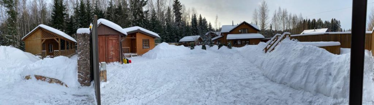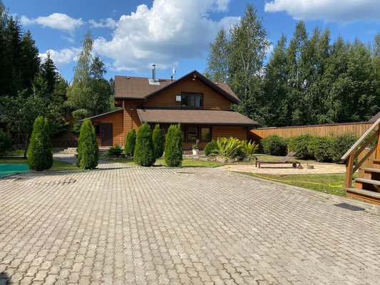 На территории оборудована беседка размером 5 на 5 метров (рядом с мангалом), финская баня с мини-кухней и дополнительным спальным местом для двоих, зона для активного отдыха (включая площадку для волейбола и кольцо для баскетбола) и гриль-домик с печью для казана и мангалом с видом на лес.