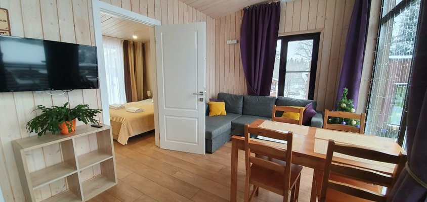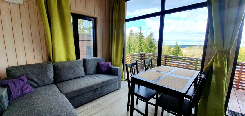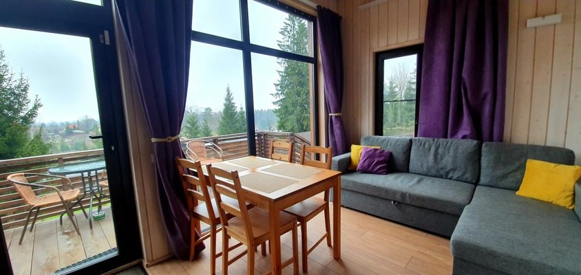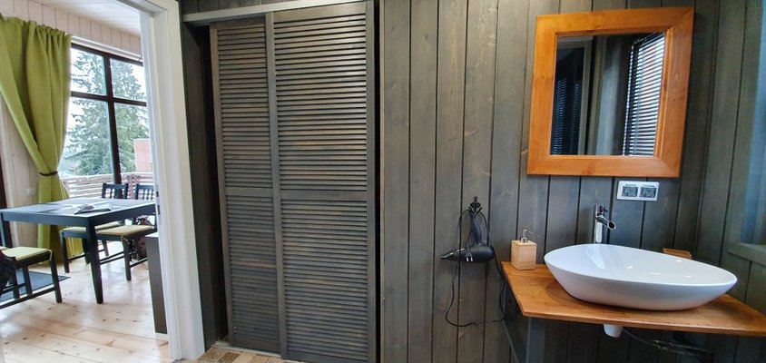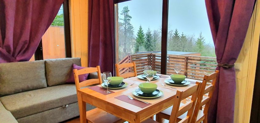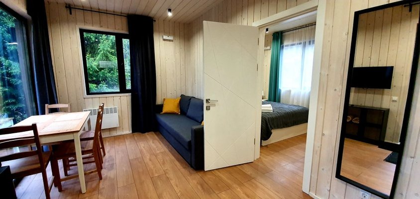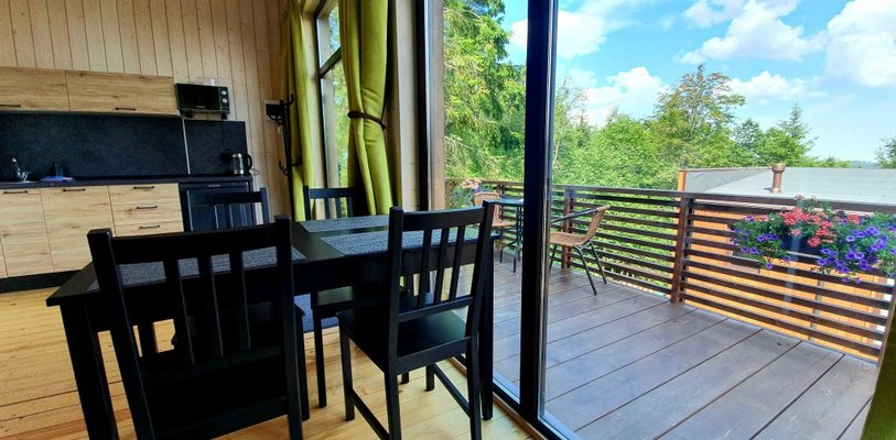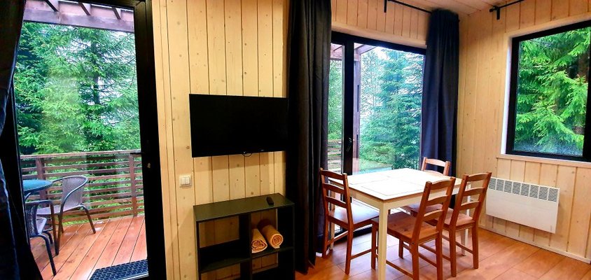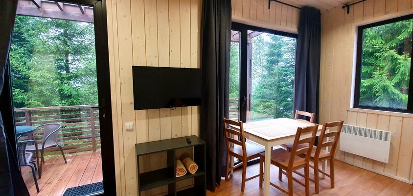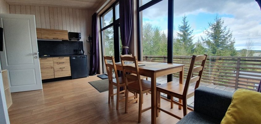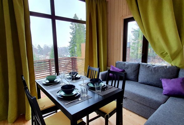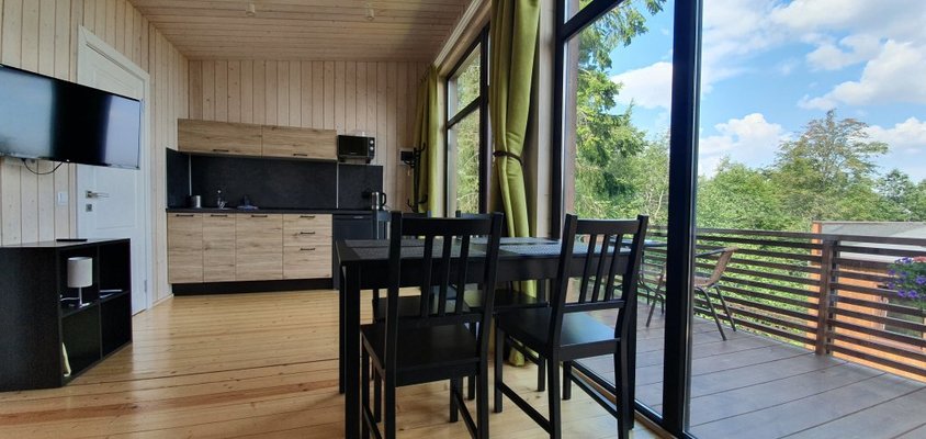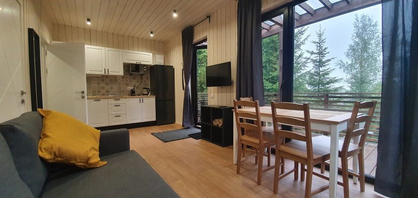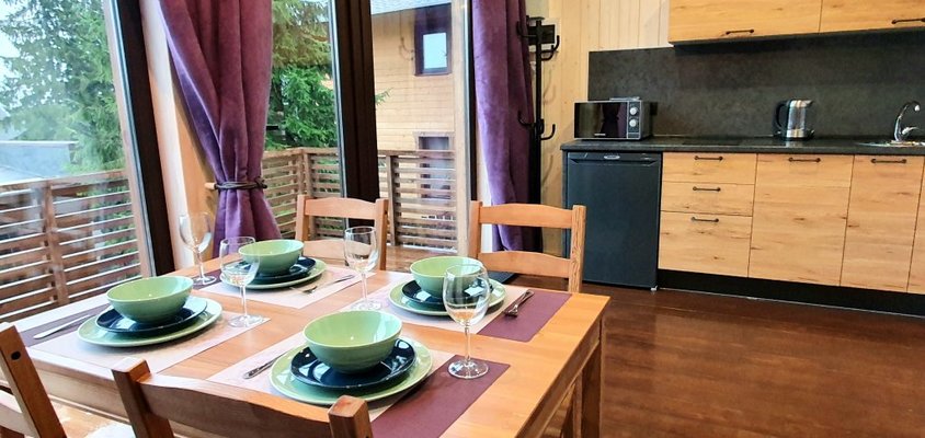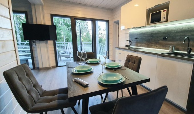 Каждый коттедж имеет свою мангальную зону. Кухня оснащена варочной панелью, холодильником, микроволновой печью и всей необходимой посудой. Гости могут выбирать, где им хочется пообедать — внутри или на свежем воздухе.