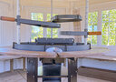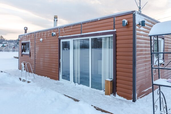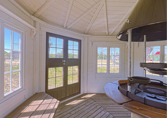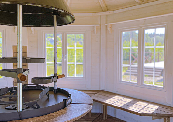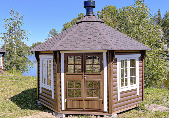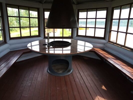 Современный гриль-домик с прекрасным видом на озеро. На улице мангал.