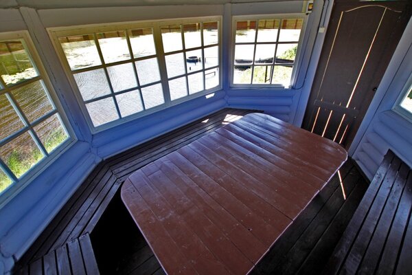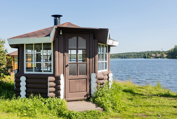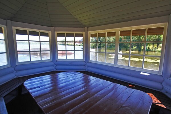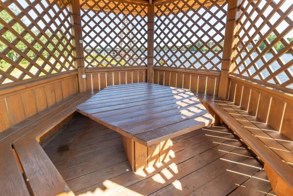 Уютная видовая беседка закрытого типа, расположенная на берегу озера.