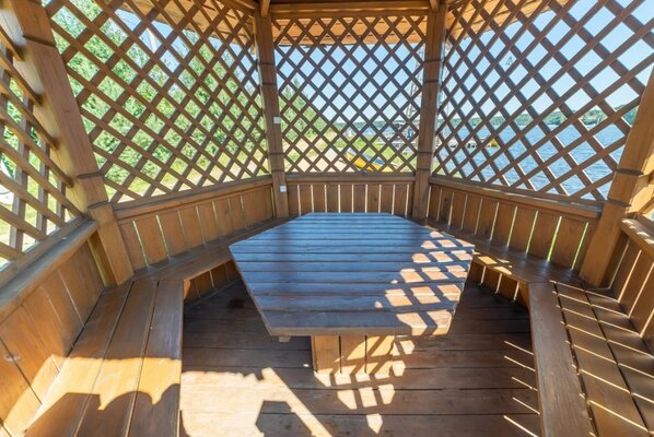 Уютная видовая беседка открытого типа, расположенная на берегу озера.
