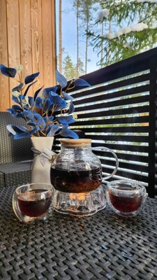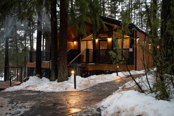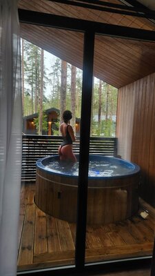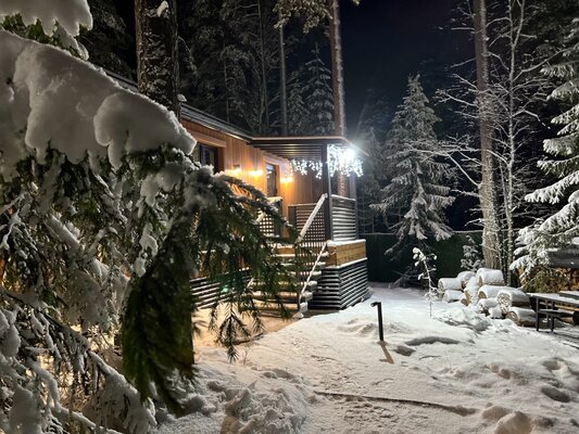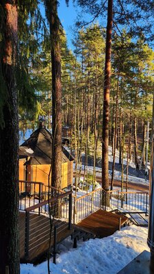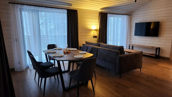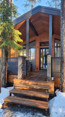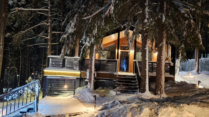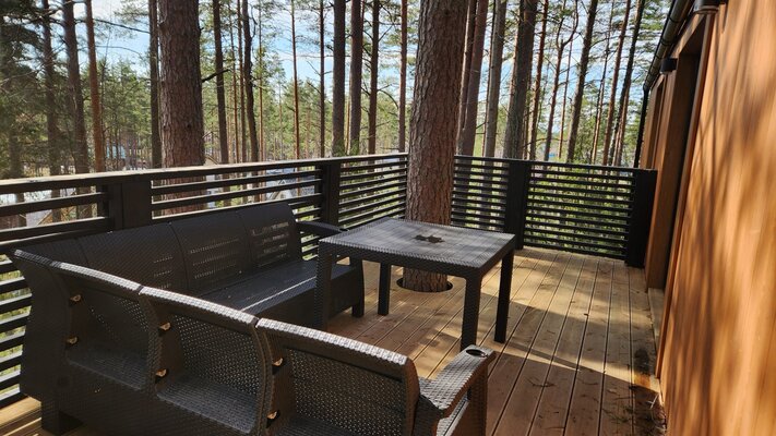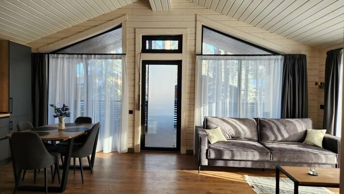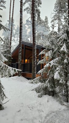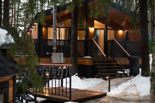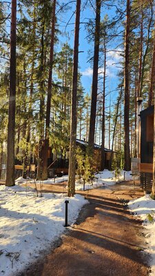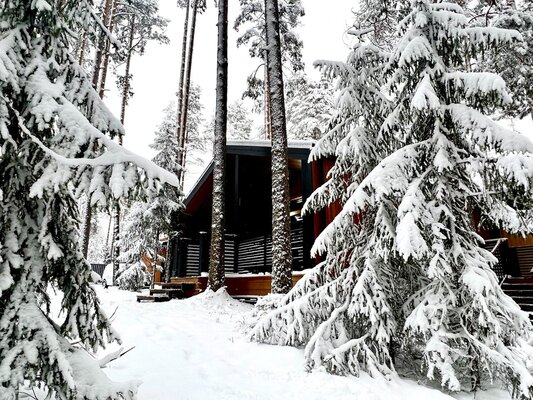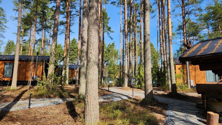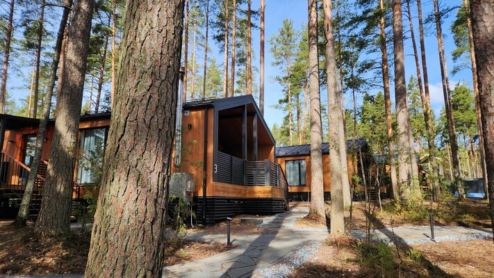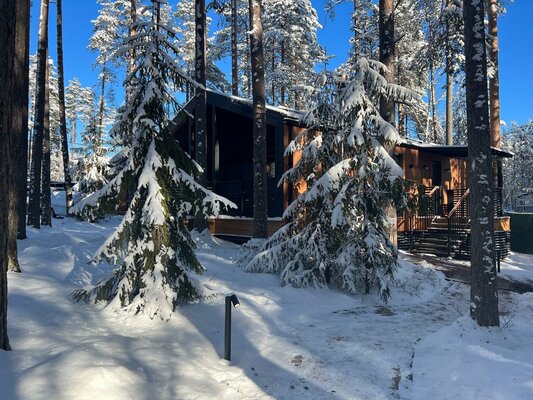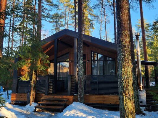 Каждый дом располагает собственной террасой с купелью и панорамным остеклением, откуда открываются захватывающие виды на хвойный лес. Продуманная планировка территории обеспечивает максимальную приватность: расположение террас и окон исключает возможность нежелательного контакта с соседями, а зеркальное покрытие панорамных окон надежно скрывает внутреннее пространство.
