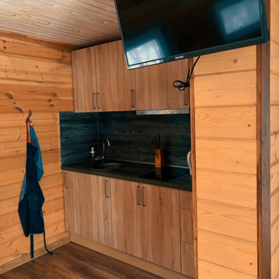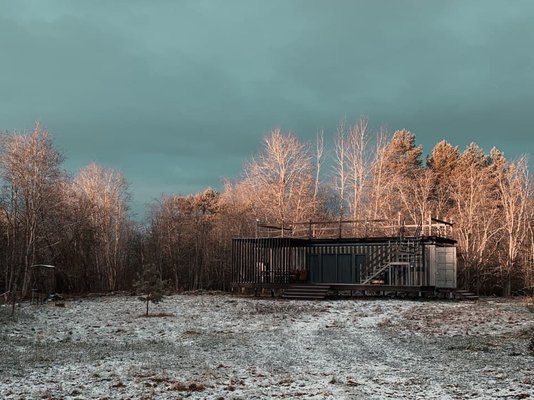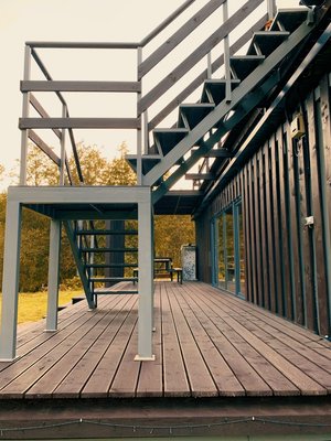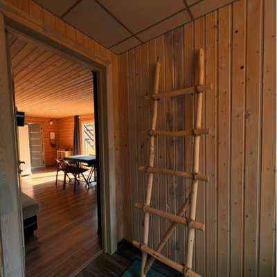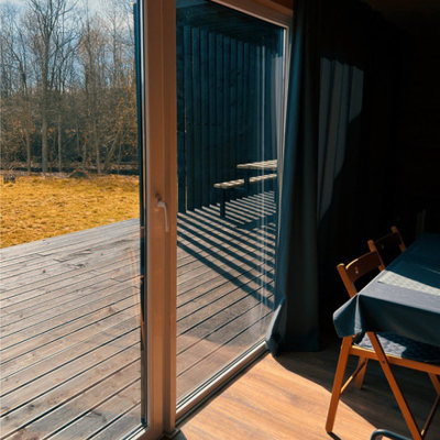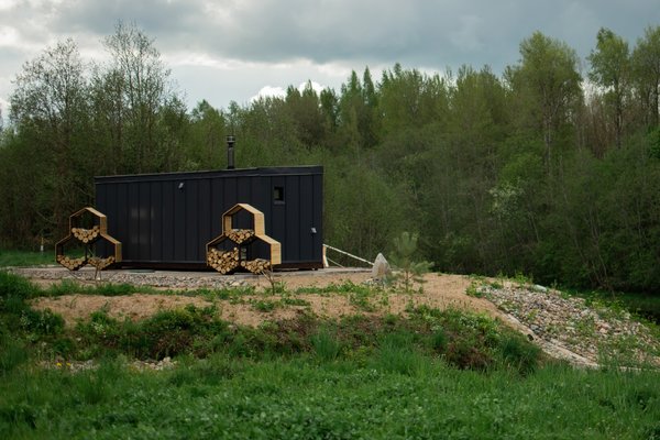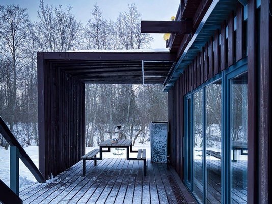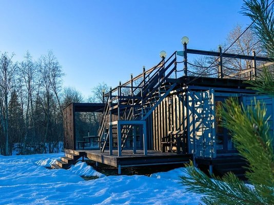 Видовая баня в современной планировке на берегу реки Лава. Есть спуск к воде и плавучий пирс с лестницей.