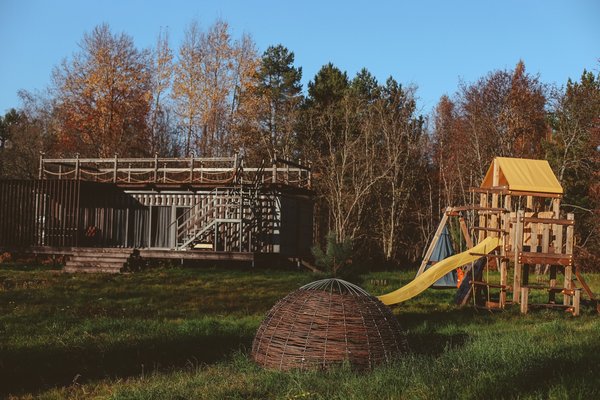 На территории базы отдыха также есть детская площадка и качели, чтобы малыши тоже могли насладиться природой и свежим воздухом.