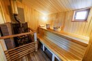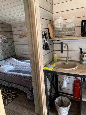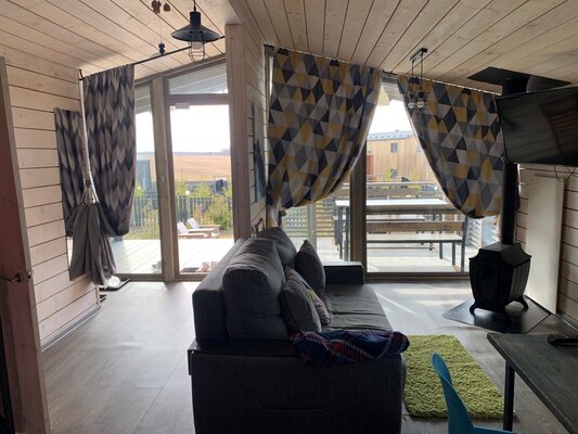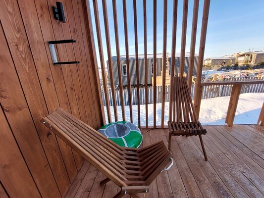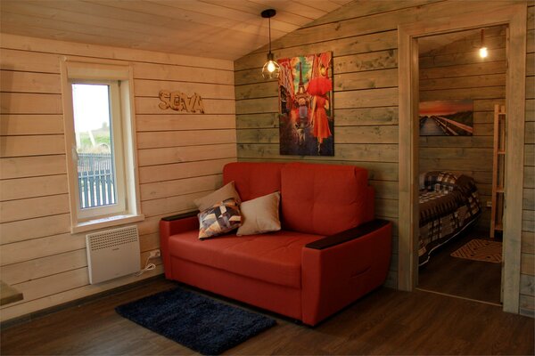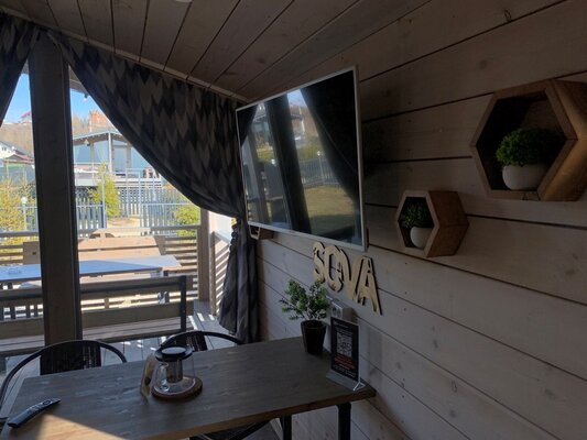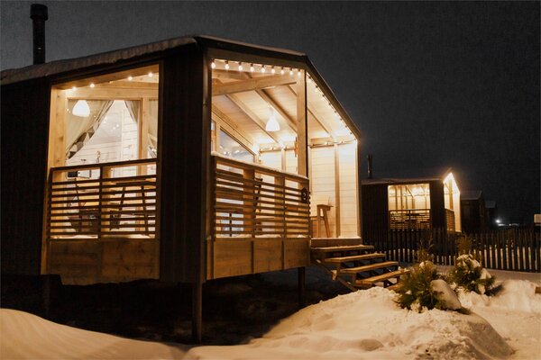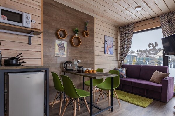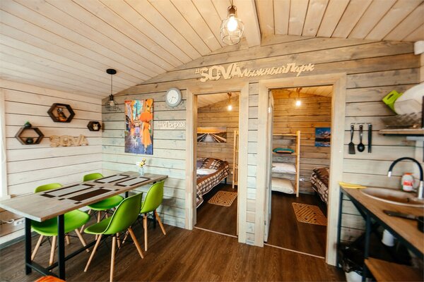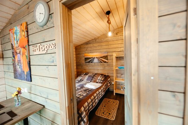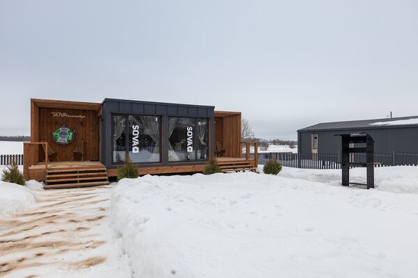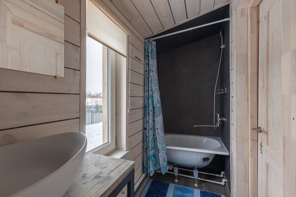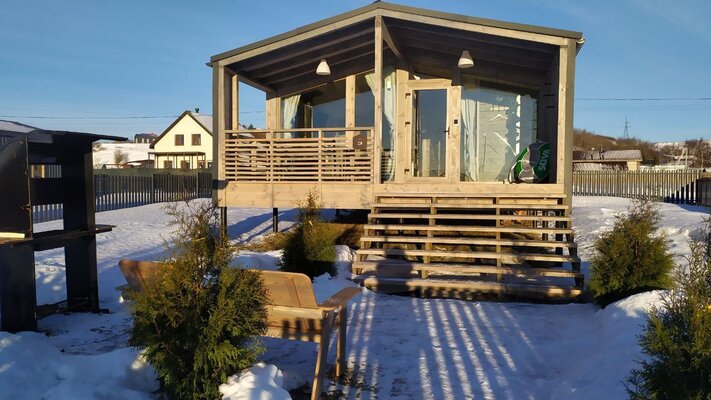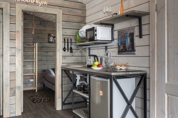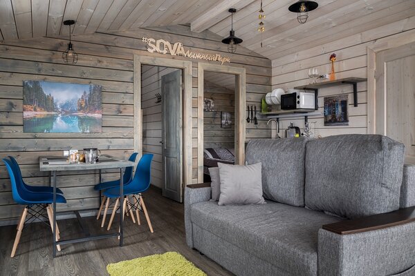 В банном доме есть кухонная зона с кулером, микроволновой печью, чайником и посудой, гостиная зона с панорамными окнами, столом, диваном и телевизором. Совмещенный санузел. Крытая терраса с уличной мебелью.