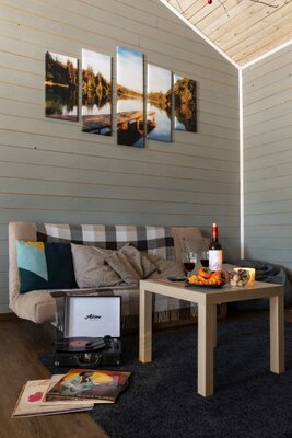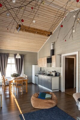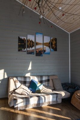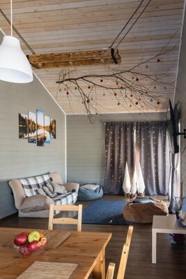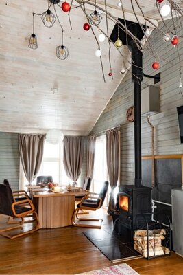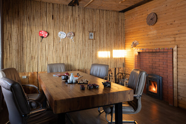 Просторная зона отдыха с камином и кухней. На кухне есть электрический чайник, микроволновая печь, посуда. В течении всего пребывания в банном комплексе, вы можете воспользоваться крытой беседкой с мангалом для приготовления блюд на углях.