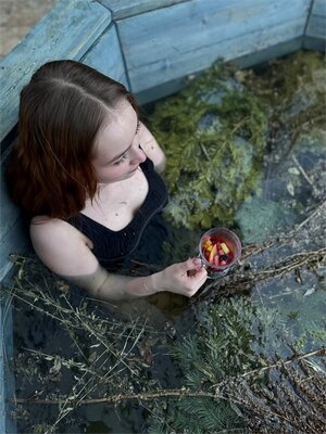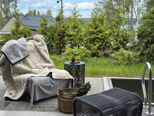 В бане «Черника» есть горячий чан, который разогревается на живом огне до комфортной температуры около 40°C. Его наполняют ароматами трав и веников, создавая особую атмосферу. Окунуться в чан можно под открытым небом, наслаждаясь природными пейзажами, свежим воздухом и целебным паром, независимо от погодных условий.