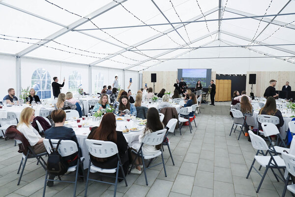 Мебель включает круглые и прямоугольные столы, а также мягкие банкетные стулья и коктейльные столики, что обеспечивает возможность гибкой настройки пространства для любого формата мероприятия.