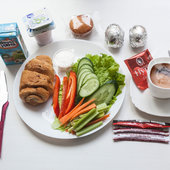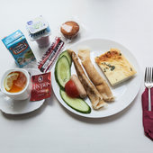 Каждое утро постояльцам подается "континентальный" завтрак, а рядом с гостиницей расположено множество кафе, ресторанов и магазинов. Если необходимо разогреть еду , то можно воспользоваться микроволновой печью на этаже, здесь также имеется чайник и кулер. В каждом номере имеется холодильник.